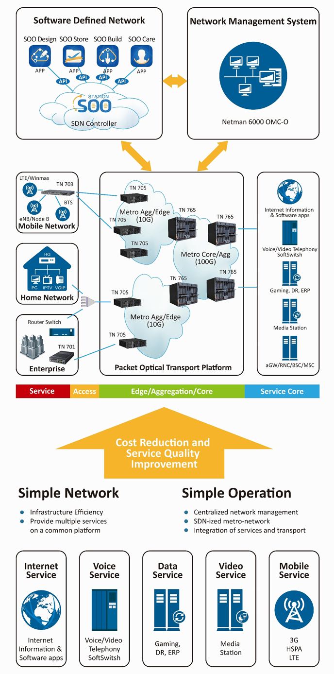 Multiple fixed-line and wireless broadband access technologies aggregated via highly efficient packet optical transport.